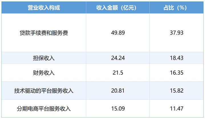 从乐信2025年主买卖务收入组成来看,贷款手续费和做事费、担保收入、财务收入居前,分手为49.89亿元、24.24亿元和21.5亿元,占总营收比例分手为37.93%、18.43%和16.35%。其中,乐信在2025年所结束的贷款手续费和做事费、担保收入,这两项的共计占比已超五成。