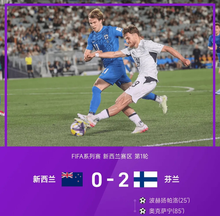 26赛季FIFA系列赛新西兰赛区第1轮,芬兰2-0校服新西兰。上半场比赛,波赫扬帕洛头球破门,随后两边均进行多半换东说念主转化,奥克萨宁终末阶段反击中推射破门,匡助芬兰锁定胜局。