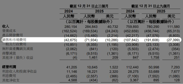 把柄最新的财报,旧年 9 月到 12 月,阿里销售用度为 719.34 亿元,而 2024 年同期是 426.75 亿,同比暴涨 68.56%。