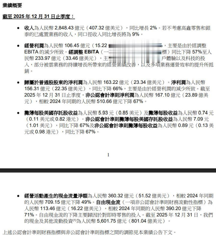 阿里巴巴 2026 财年第三财季,营收同比增长 2% 至 2848.4 亿元,经退换净利润同比着落 67% 至 167.1 亿元。