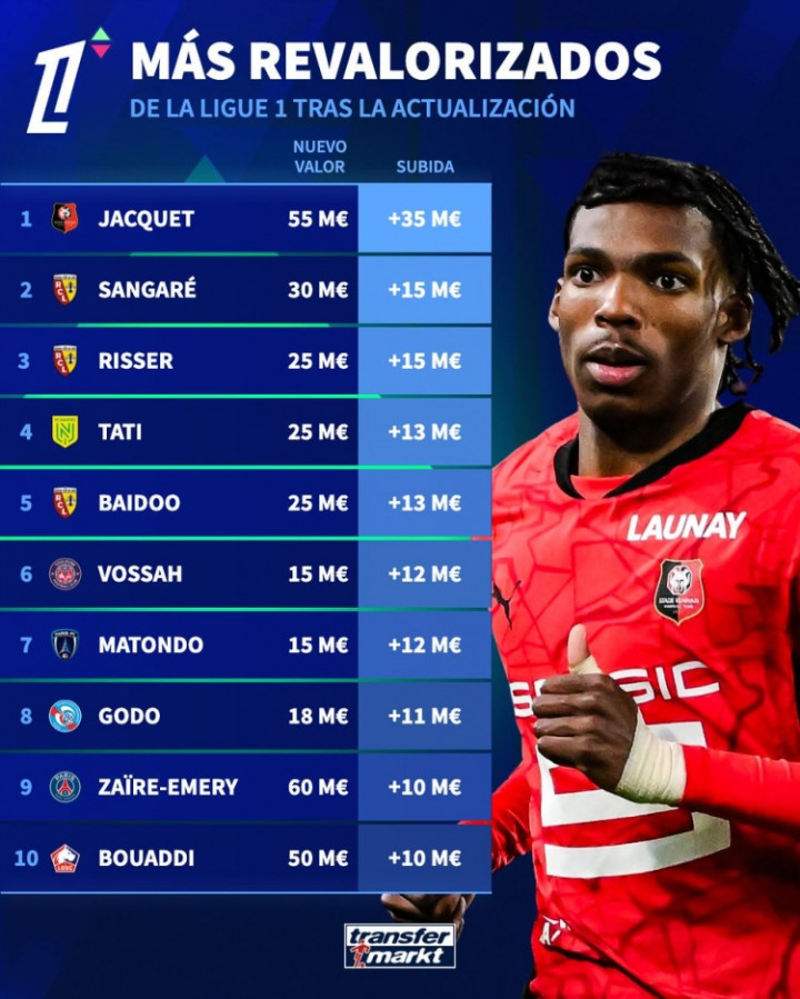 天博体育官方网站 法甲球员德回身价高涨榜: 雅凯+3500万欧居首, 埃梅里+1000万欧